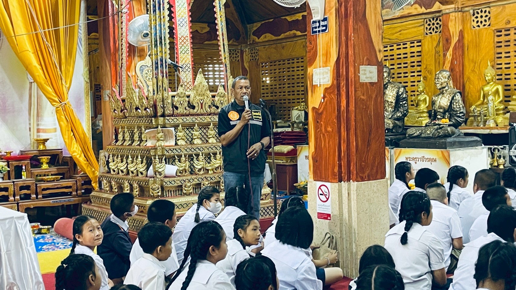 นักเรียนชั้นประถมศึกษาปีที่ 5/3-5/5 โรงเรียนบ้านจอมบึง(วาปีพร้อมประชาศึกษา) ร่วมพิธีทำบุญตักบาตร เนื่องในวันพระ ณ วัดจอมบึง อำเภอจอมบึง จังหวัดราชบุรี