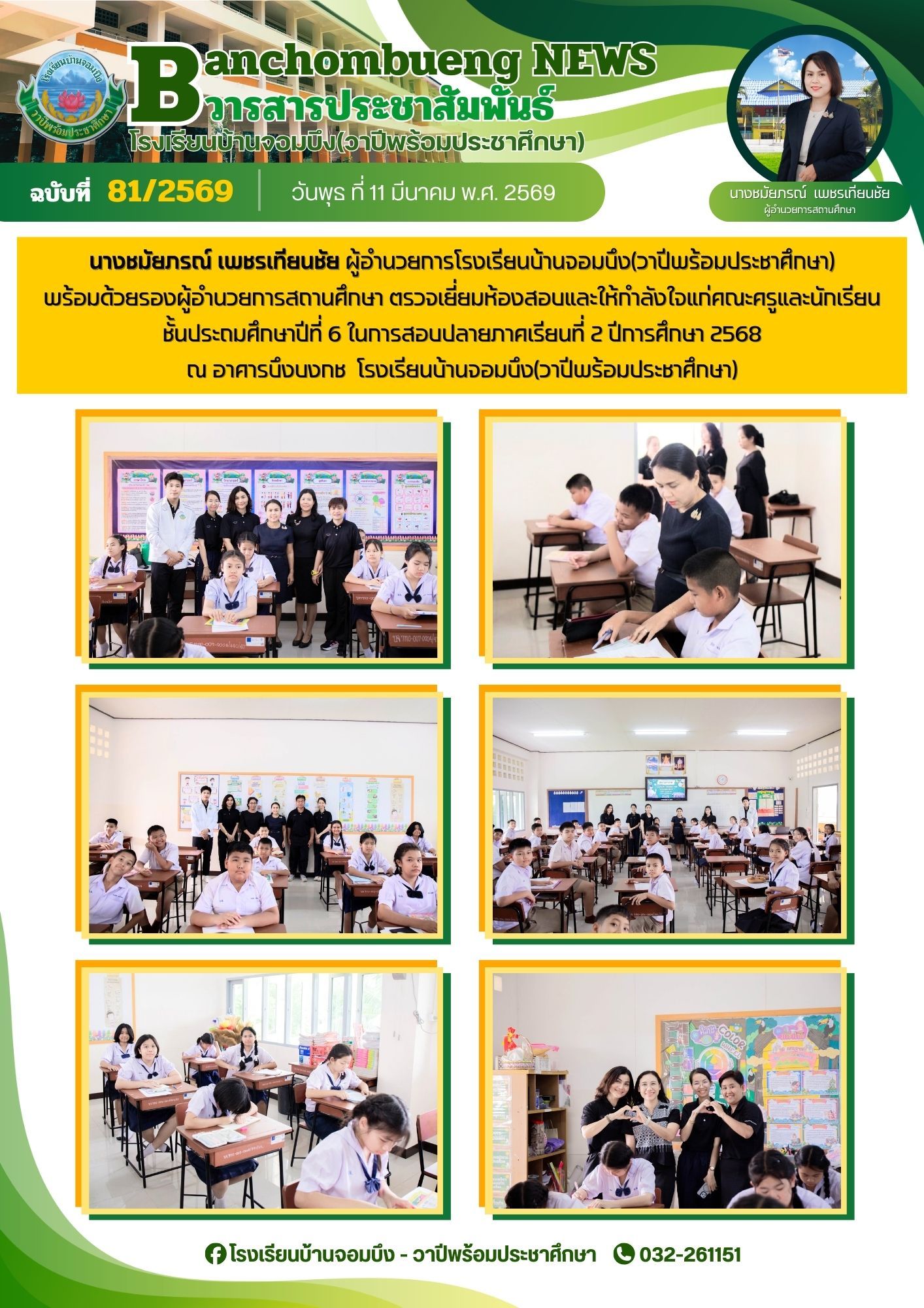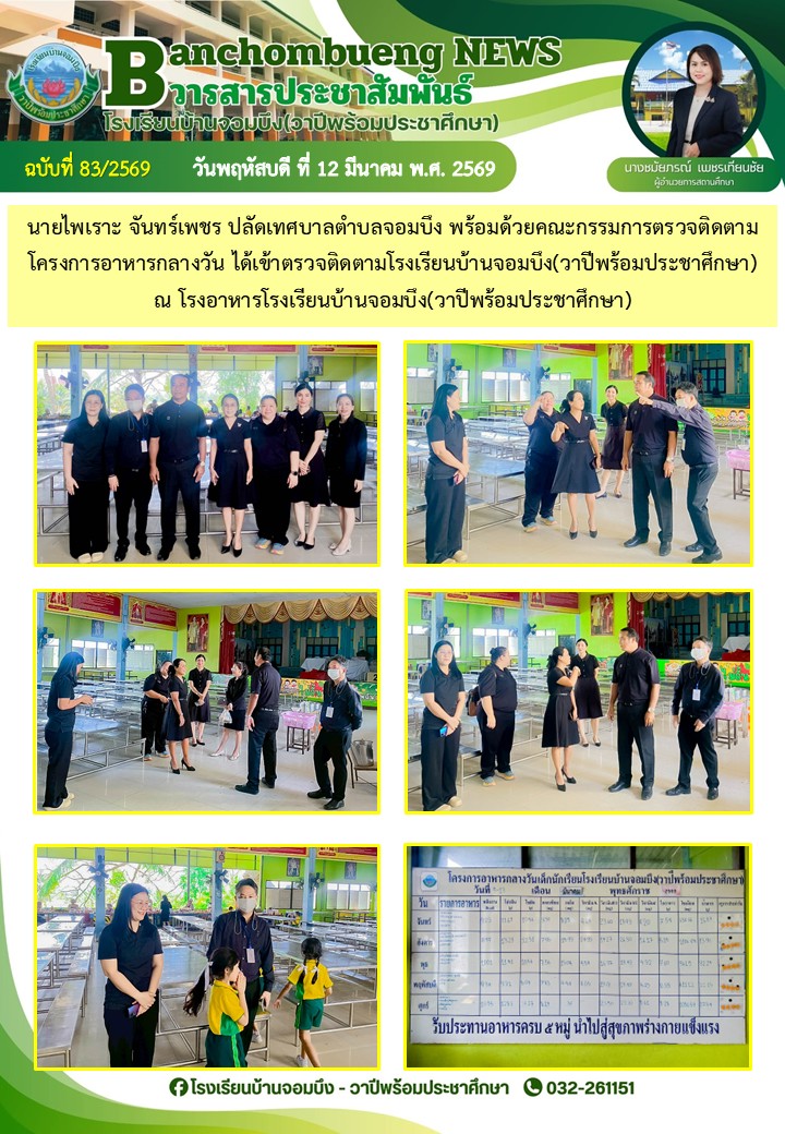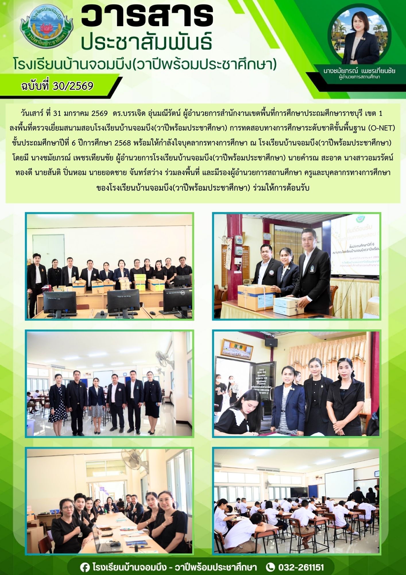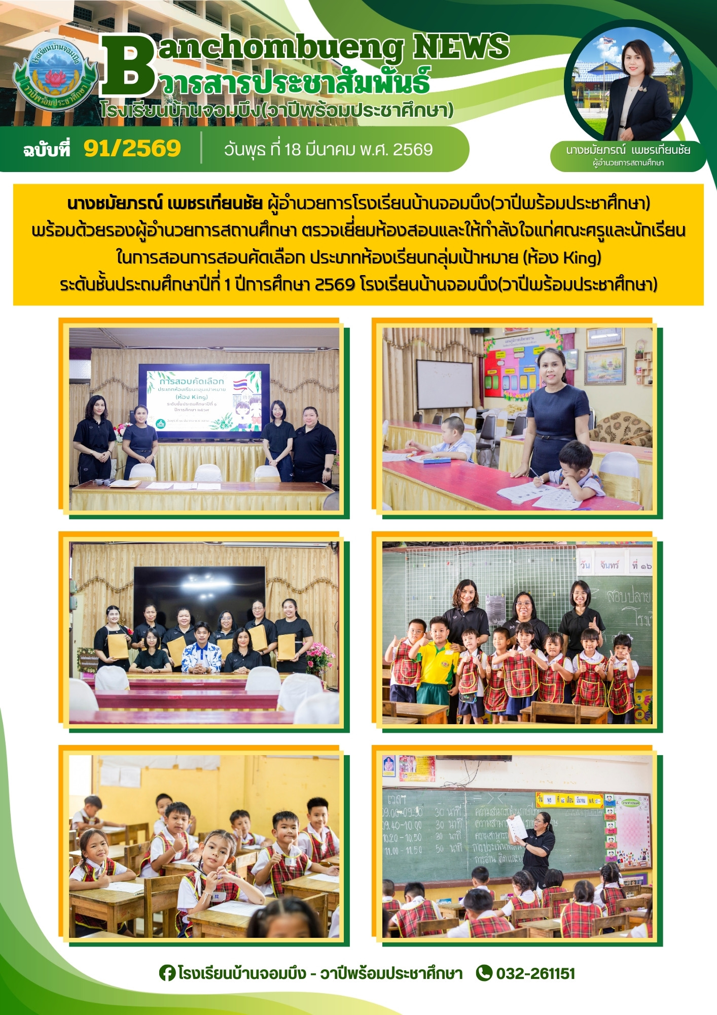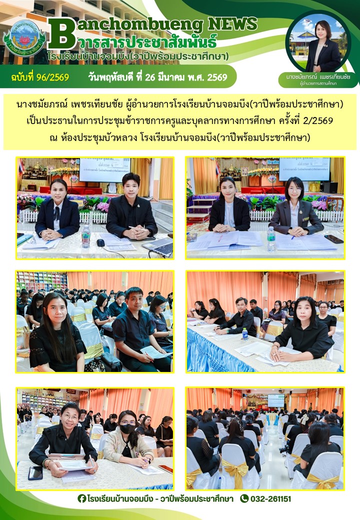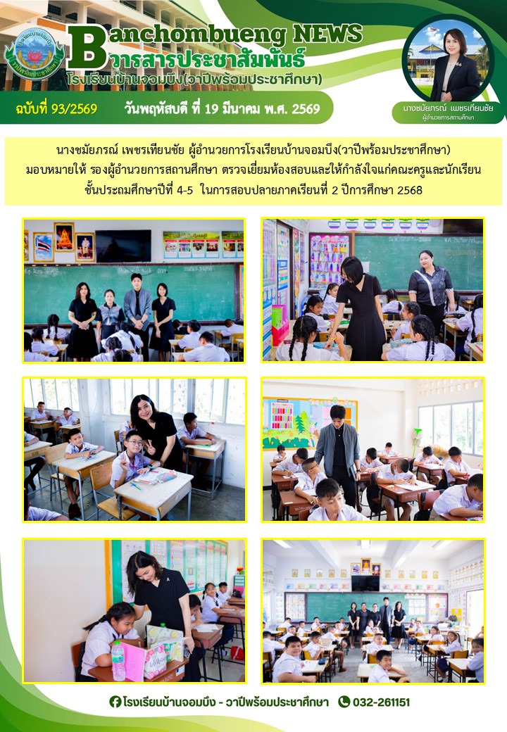 นางชมัยภรณ์ เพชรเทียนชัย ผู้อำนวยการโรงเรียนบ้านจอมบึง(วาปีพร้อมประชาศึกษา) พร้อมด้วยรองผู้อำนวยการสถานศึกษา ตรวจเยี่ยมห้องสอบและให้กำลังใจแก่คณะครูและนักเรียน ในการสอบการสอบคัดเลือก ประเภทห้องเรียนกลุ่มเป้าหมาย (ห้อง King) ระดับชั้นประถมศึกษาปีที่ 1 ปีการศึกษา 2569 โรงเรียนบ้านจอมบึง(วาปีพร้อมประชาศึกษา)