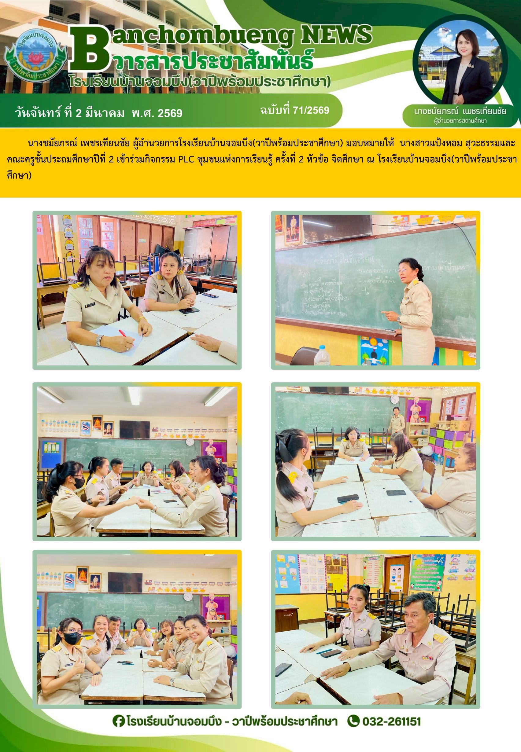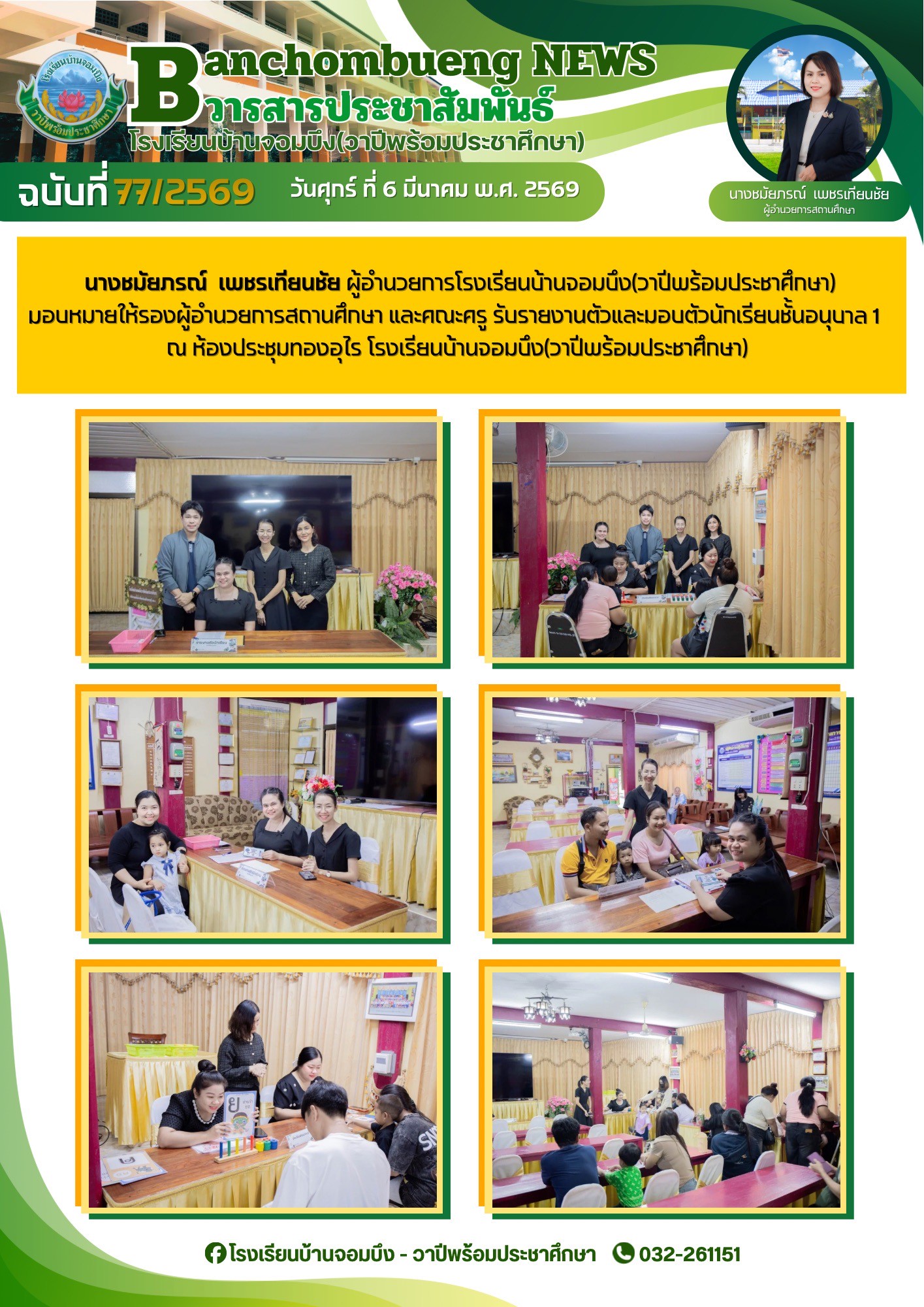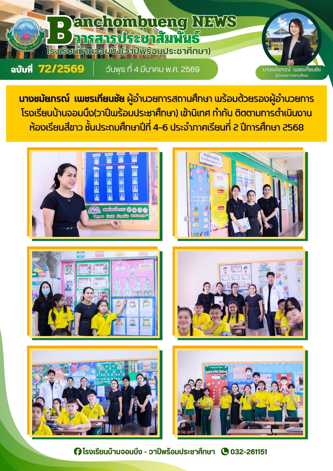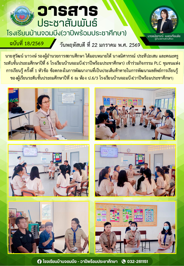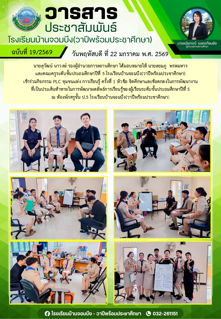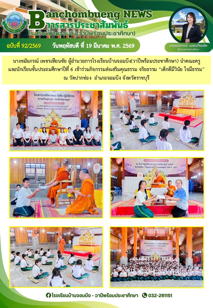 นางชมัยภรณ์ เพชรเทียนชัย ผู้อำนวยการโรงเรียนบ้านจอมบึง(วาปีพร้อมประชาศึกษา) พร้อมด้วยรองผู้อำนวยการสถานศึกษา ตรวจเยี่ยมห้องสอบและให้กำลังใจแก่คณะครูและนักเรียน ในการสอบการสอบคัดเลือก ประเภทห้องเรียนกลุ่มเป้าหมาย (ห้อง King) ระดับชั้นประถมศึกษาปีที่ 1 ปีการศึกษา 2569 โรงเรียนบ้านจอมบึง(วาปีพร้อมประชาศึกษา)