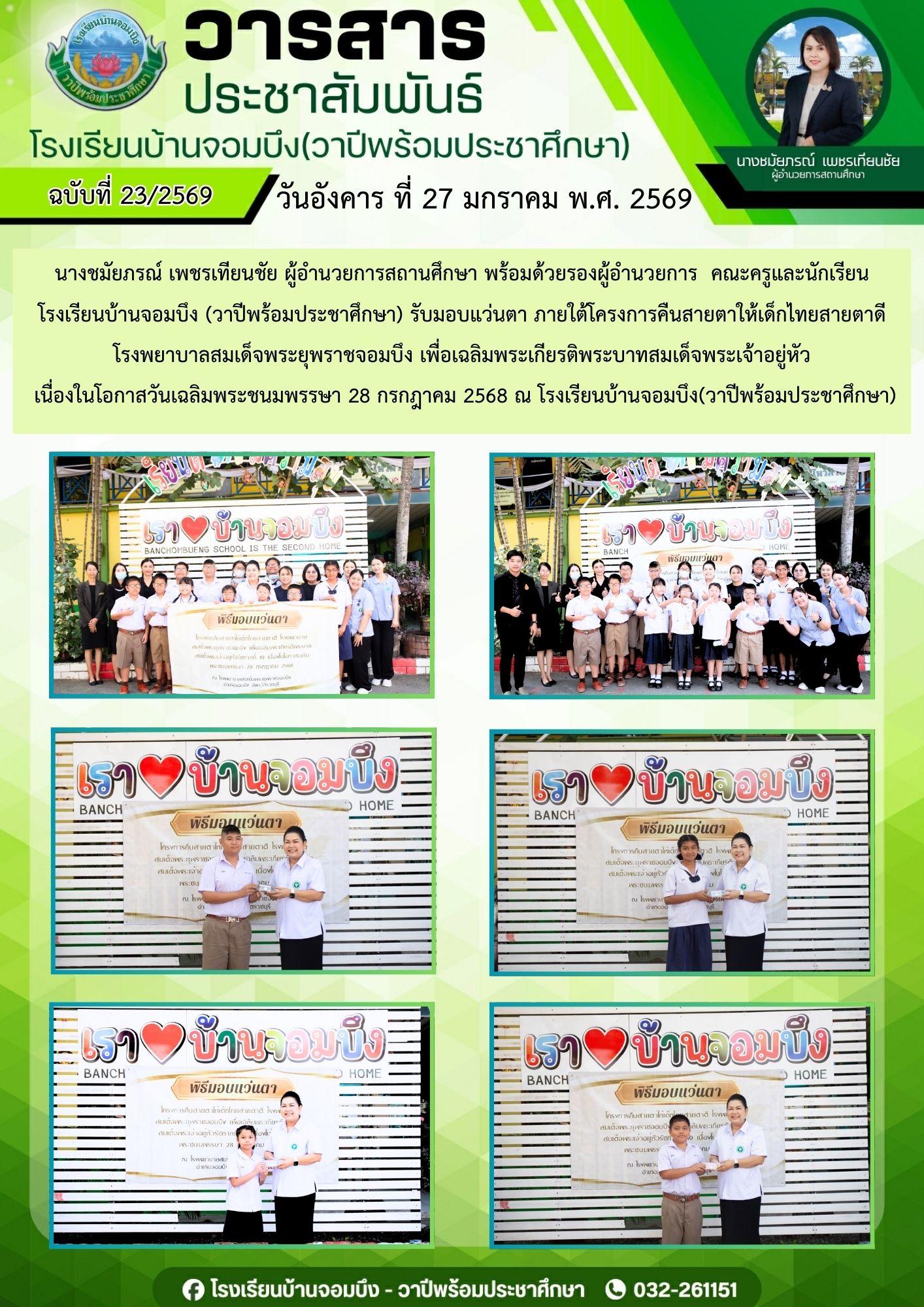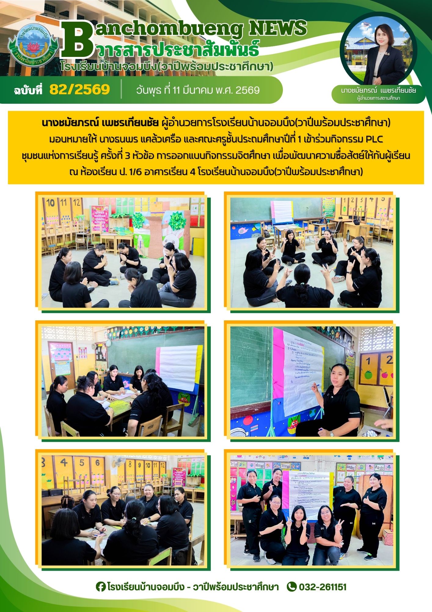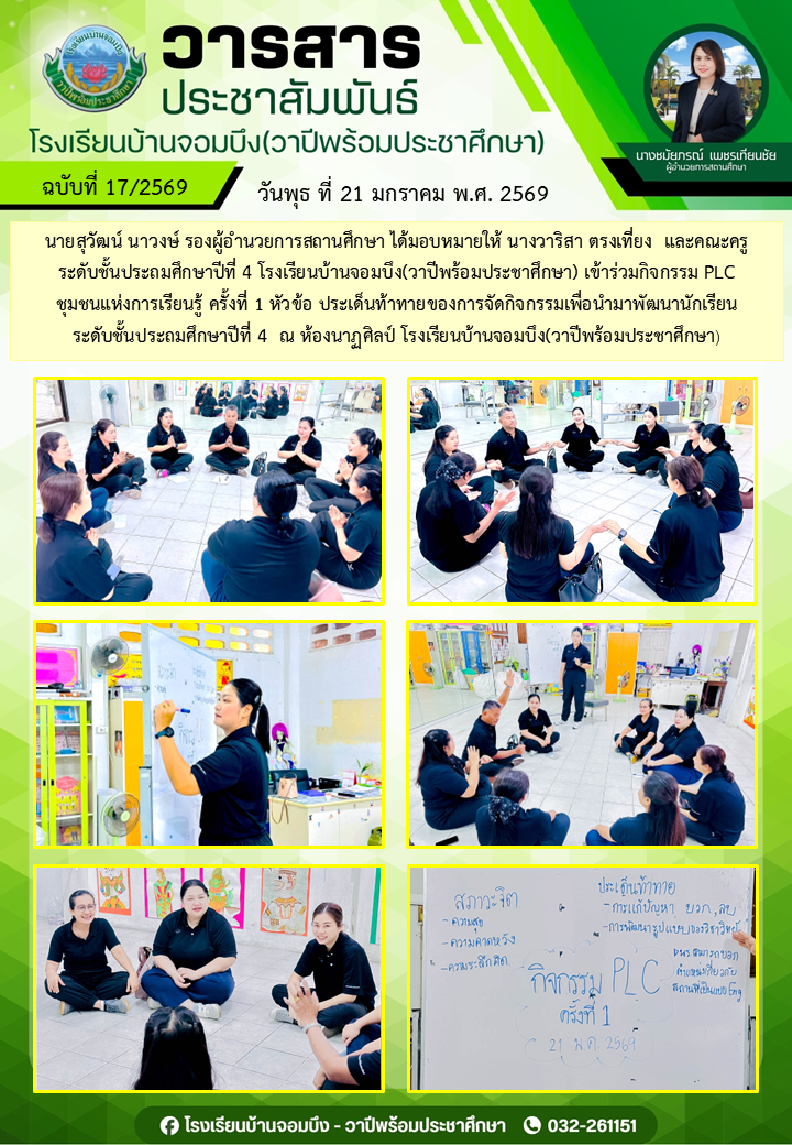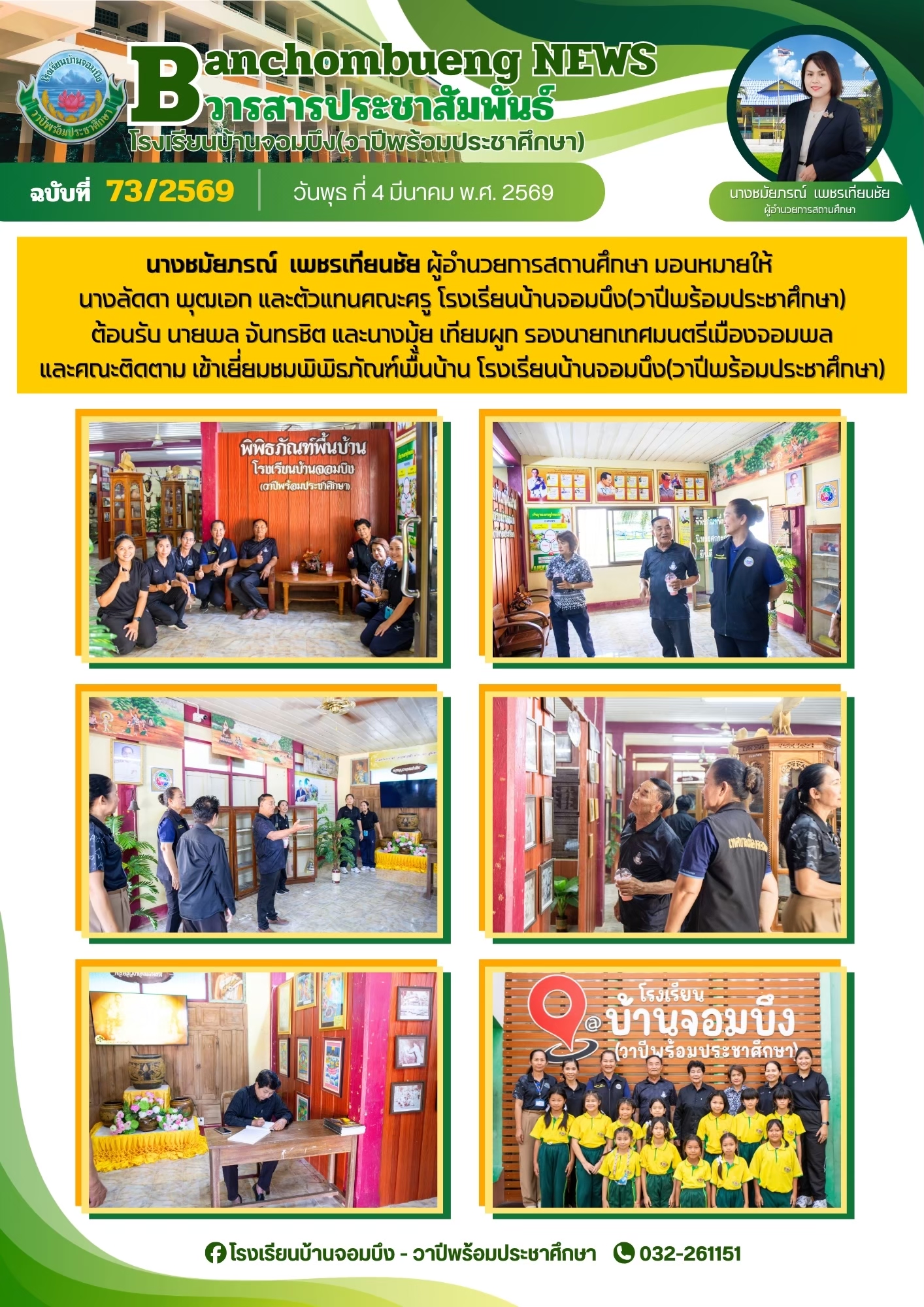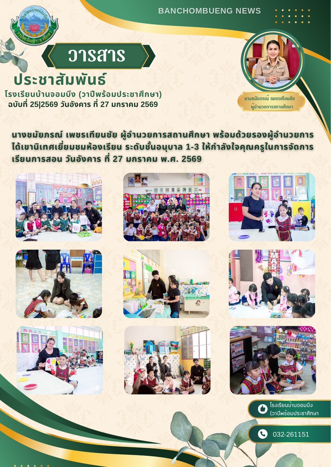นางชมัยภรณ์ เพชรเทียนชัย ผู้อำนวยการโรงเรียนบ้านจอมบึง(วาปีพร้อมประชาศึกษา) พร้อมด้วยรองผู้อำนวยการสถานศึกษา ตรวจเยี่ยมห้องสอบและให้กำลังใจแก่คณะครูและนักเรียน ในการสอบการสอบคัดเลือก ประเภทห้องเรียนกลุ่มเป้าหมาย (ห้อง King) ระดับชั้นประถมศึกษาปีที่ 1 ปีการศึกษา 2569 โรงเรียนบ้านจอมบึง(วาปีพร้อมประชาศึกษา)