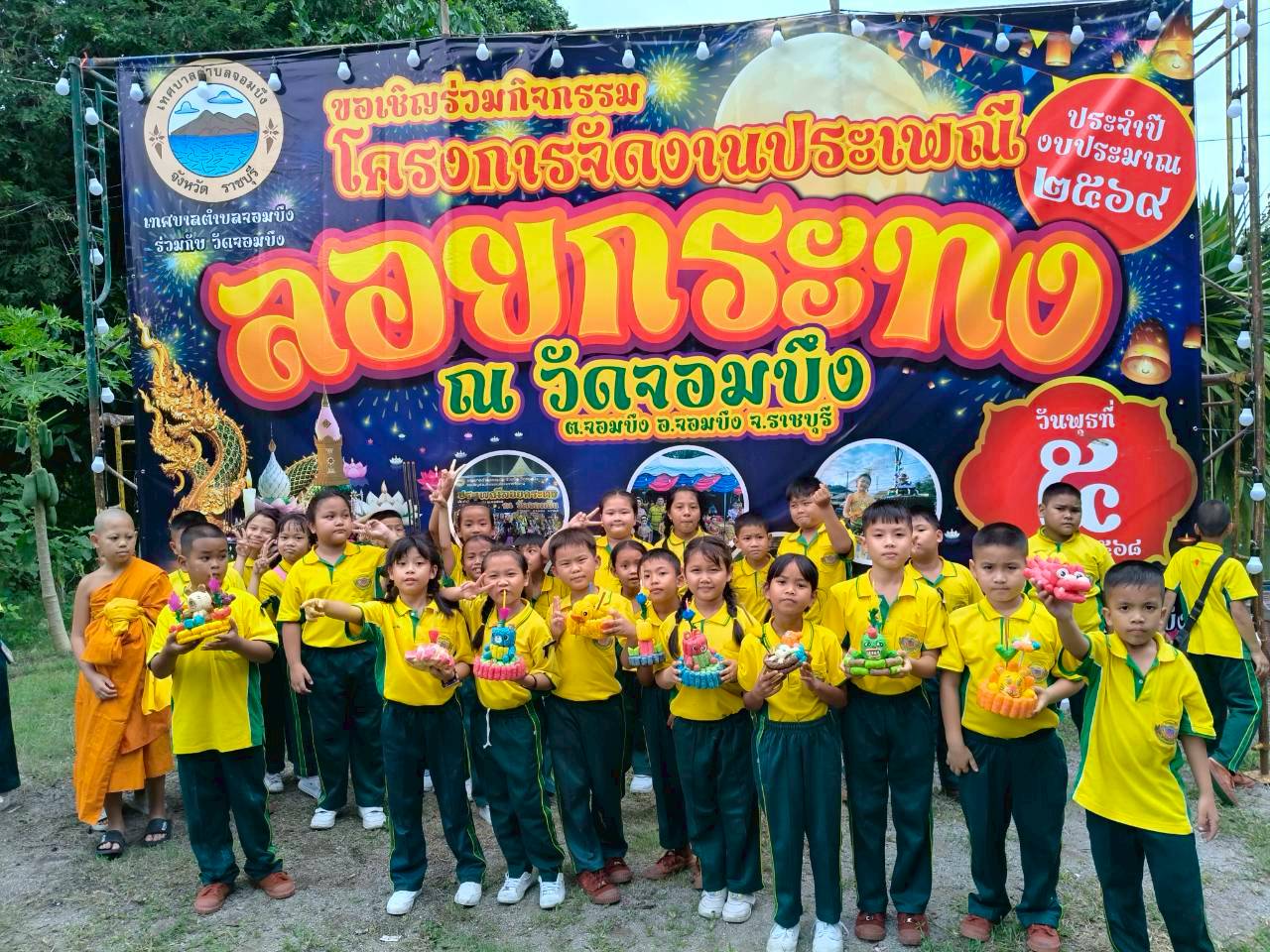 ข้าราชการครู บุคลากรทางการศึกษา นักศึกษาฝึกประสบการณ์วิชาชีพ และนักเรียน โรงเรียนบ้านจอมบึง(วาปีพร้อมประชาศึกษา) ร่วมกันประดิษฐ์กระทง ที่ทำจากวัสดุธรรมชาติ เพื่อนำไปถวายให้กับวัดจอมบึง