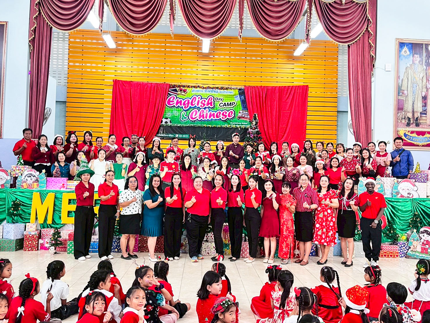 นางชมัยภรณ์ เพชรเทียนชัย ผู้อำนวยการโรงเรียนบ้านจอมบึง(วาปีพร้อมประชาศึกษา) เป็นประธานในพิธีเปิดกิจกรรมค่ายสานสัมพันธ์สองภาษา English & Chinese Day Camp